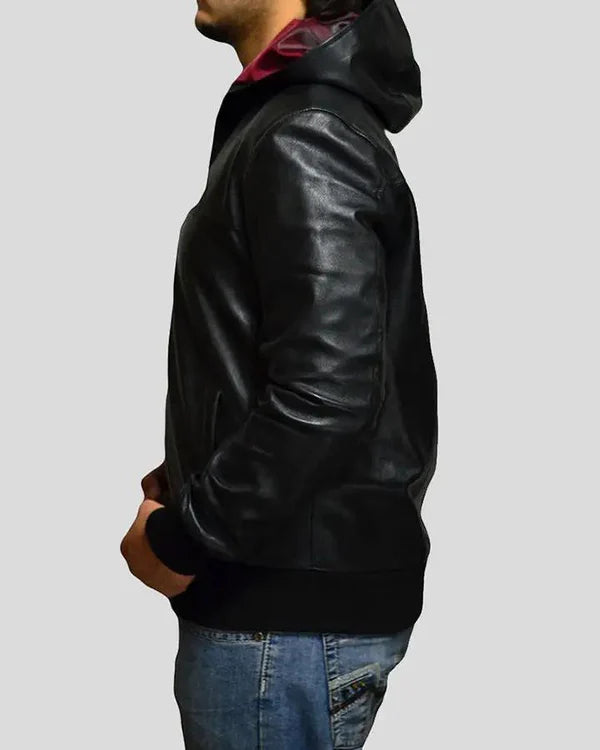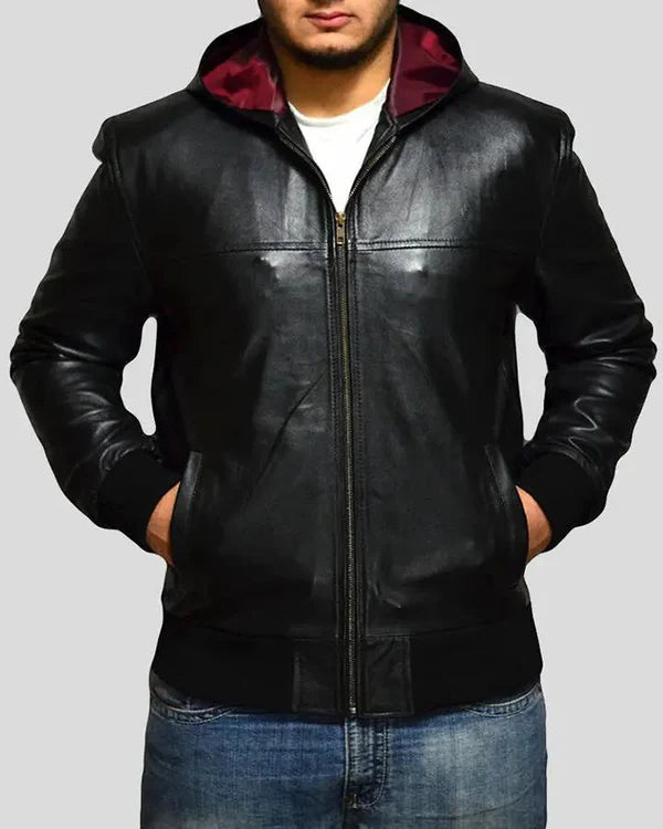 Men's Genuine Lambskin Bomber Hooded Leather Jacket RXMJ0014